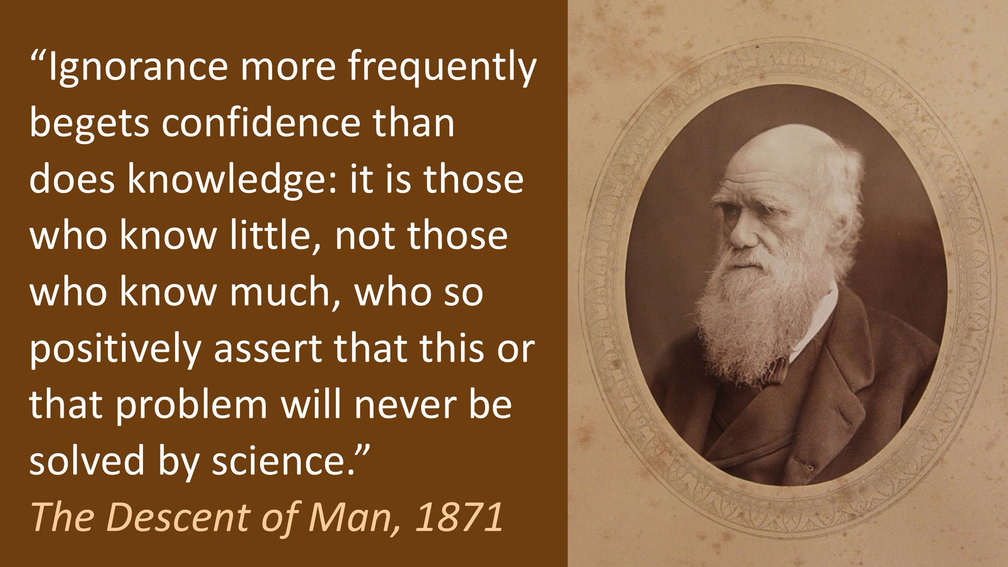 Charles Darwin 1871. Is it true that confidence sometimes signals ignorance. It is those who know little and not those who know much who so positively assert that this or that problem will never be solved by science Charles Darwin quotes English Naturalist and Author of the theory of evolution by natural selection. Ignorance more frequently begets confidence than does knowledge. Ignorance more frequently begets confidence than does knowledge. Charles Darwin followed that up in 1871 with ignorance more frequently begets confidence than does knowledge. Ignorance more frequently begets confidence than does knowledge. It is those who know little and not those who know much who so positively assert that this or that problem. Michel de Montaigne essayist 1533-1592 Charles Darwin once said.